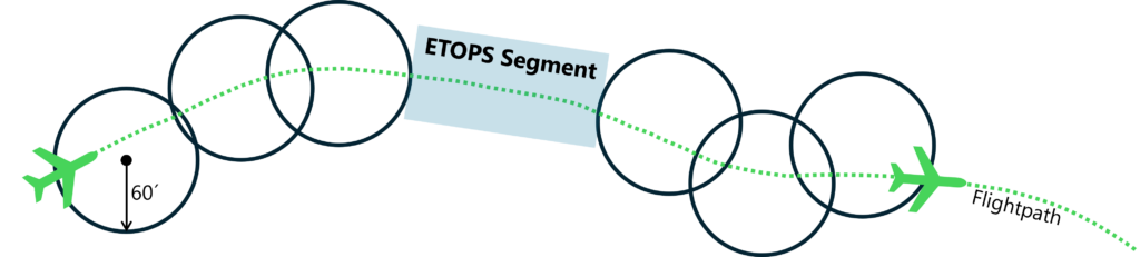 Die folgende Abbildung soll das Problem bei Flügen in abgelegenen Regionen ohne ausreichende Flughafenabdeckung darstellen (z.B. Flug über den Nordatlantik). Hier sind wir über Land so gut wie immer in einem 60 Minuten Radius um einen Flughafen, sodass wir im Notfall diesen ansteuern könnten. Sind wir jedoch über Wasser, so ist die Distanz zwischen den Flughäfen zu groß und wir könnten in diesem Segment im schlimmsten Fall keinen Flughafen erreichen. Dieses Segment nennen wir ETOPS-Segment.